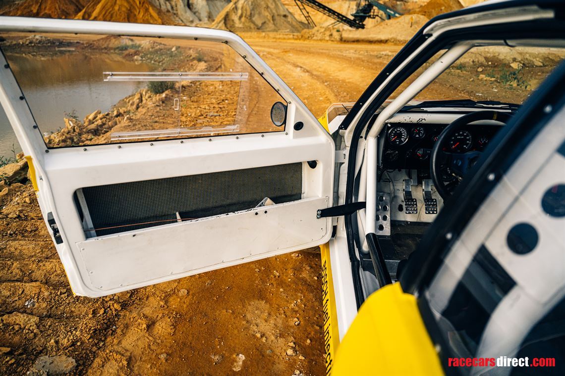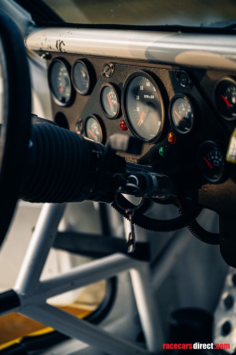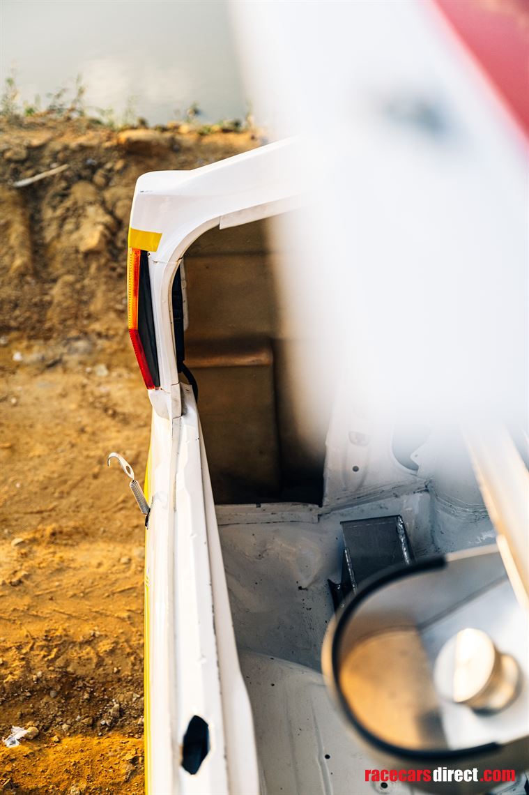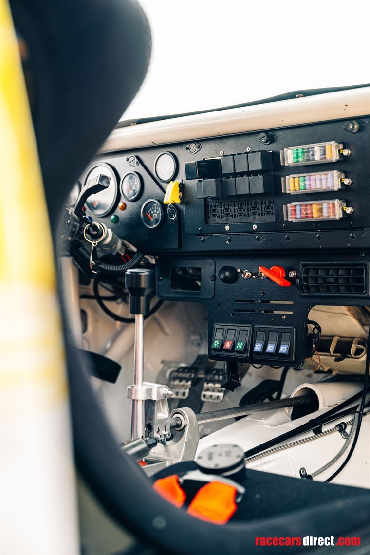 - The specification includes VDO dials, drilled pedals, a fire extinguisher, a white roll cage, a Sparco steering wheel, and two black Recaro bucket seats with red Sabelt harnesses.