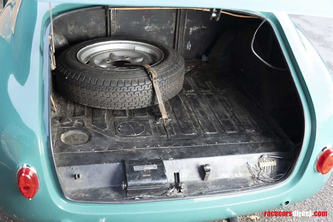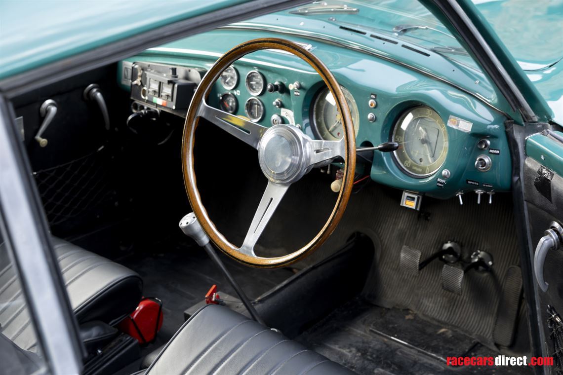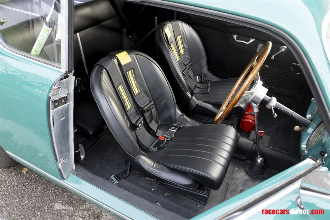 Other performance items include adjustable telescopic dampers, aluminium-cored radiator, Kenlowe fan, lightened flywheel, external oil cooler, spin-on oil filter adaptor, electric fuel pump, aluminium foam-filled fuel tank and lower and stiffer road springs. Also fitted are race legal period-style black leather bucket seats, Alfa Romeo 1900 alloy front brake drums with improved cooling, an external electric cut-off switch and a dashboard-mounted Brantz rally timer.