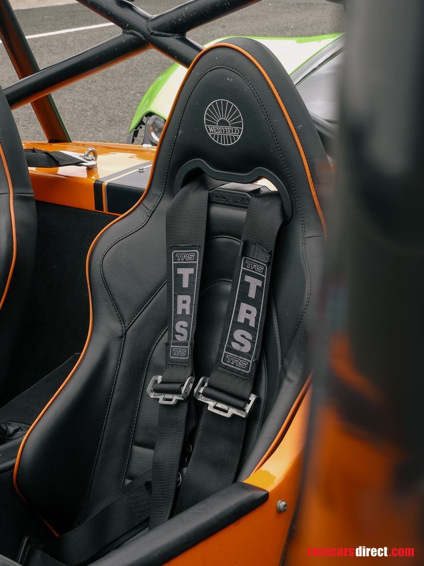 SEIW wide body, FW rear bodywork, carbon fibre aero screen, V8 Bonnet, custom intercooler bonnet scoop wrapped to match bodywork and improve intercooler performance, carbon fibre indicator pods and whiskers, black Westfield cycle wings, engine oil cooler and supercharger oil cooler, upgraded Protech 1 way adjustable shock absorbers all round with uprated Westfield springs, aero wide track front end, LSD with breather oil catch tank, adjustable anti roll bars front and rear, FIA approved roll bar, Race Technology DASH2 programmable digital dash, USB and 12V charging points, CTek trickle charger plug, removable sparco steering wheel, Lowered Floors, Cobra sports turbo seats, fully carpeted throughout, TRS Magnum 4 point harnesses, heater, LED front indicators, 13” Team Dynamics Pro Race 1.2 7J wheels upgraded front four pot Hispec Calipers with vented and grooved discs and upgraded rear Hispec calipers