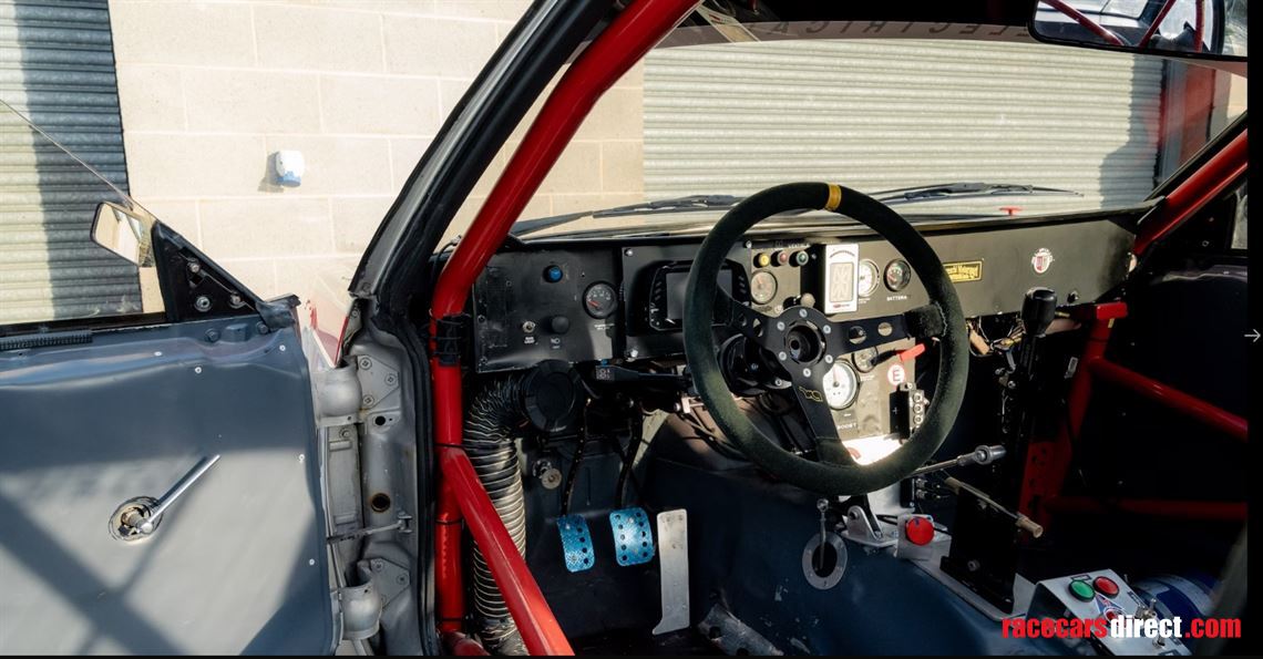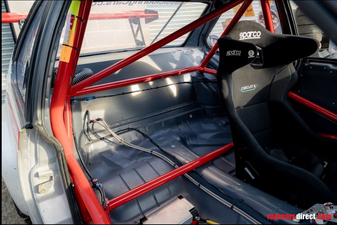 - Equipment includes kill switches, a fibreglass louvred bonnet, fibreglass bumpers, Plexiglass rear windows, an Alcantara-trimmed steering wheel, a Sparco Circuit II bucket seat, a full roll cage, simplified door cards, push-button start, a Tractive sequential gear shifter, braided fuel lines, a driver’s harness, an AiM digital dashboard display, a plumbed-in fire extinguisher system, a large Maxi Racing boost pressure gauge, a custom dashboard and centre console, an ATL aluminium fuel cell, a fibreglass boot lid with drilled hinges, an aluminium oil catch can, and aftermarket adjustable suspension. Flatshifetr, air jacks.