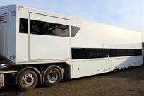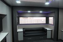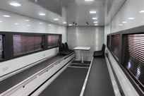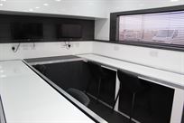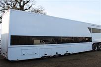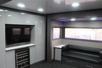 Lower deck for 2 cars with two separate work areas including data area with two TVs and fridges. Additional table/seating area at rear for 6 people. Multiple storage draws and hatch into top deck. Removable bulkhead between the two areas. Unwin track fitted throughout.