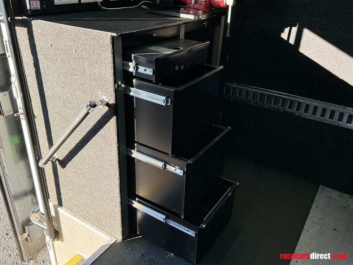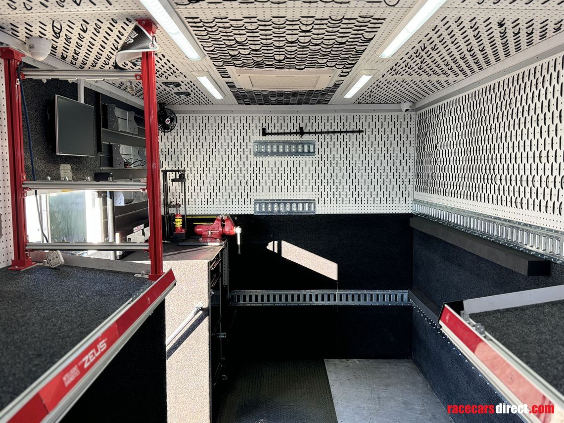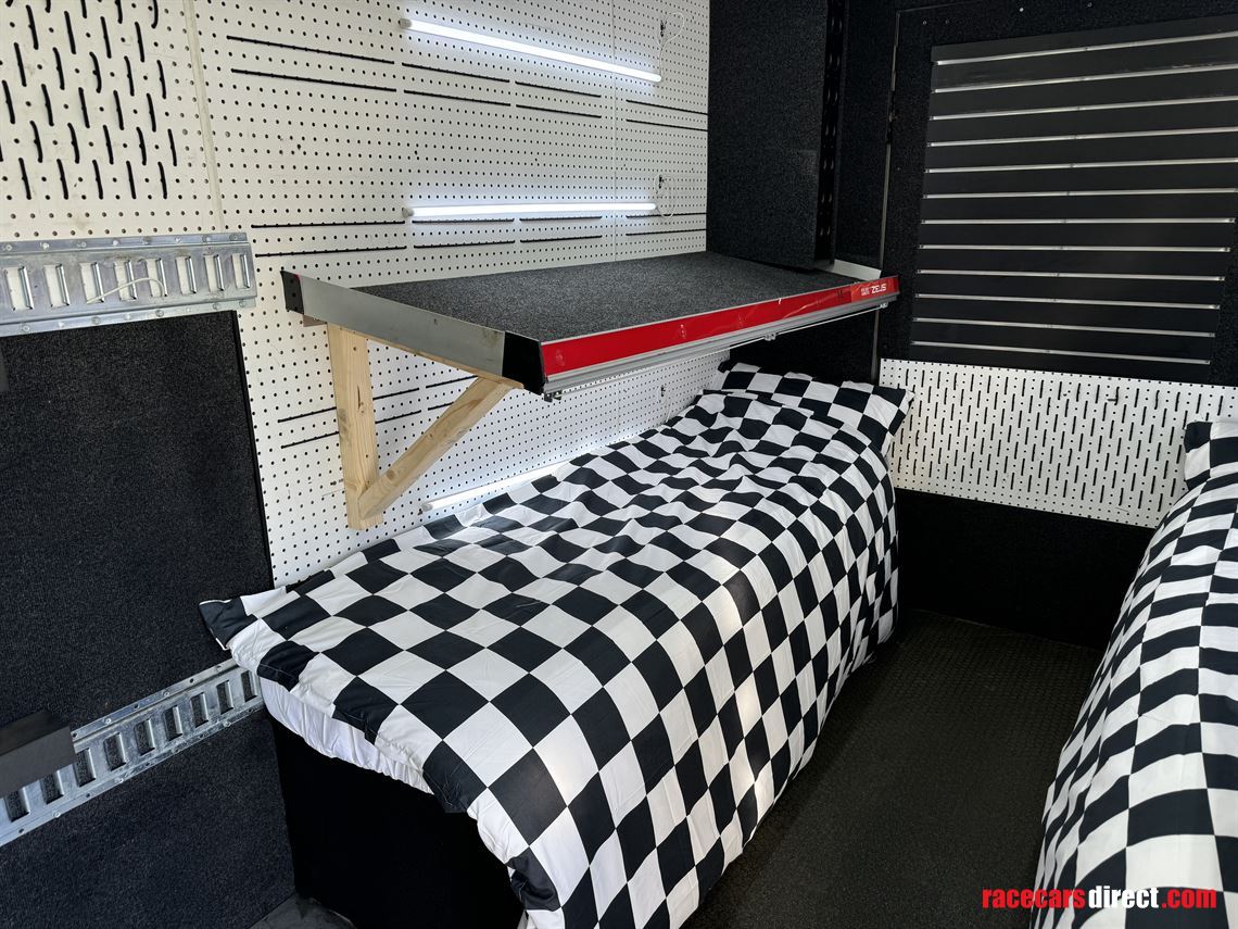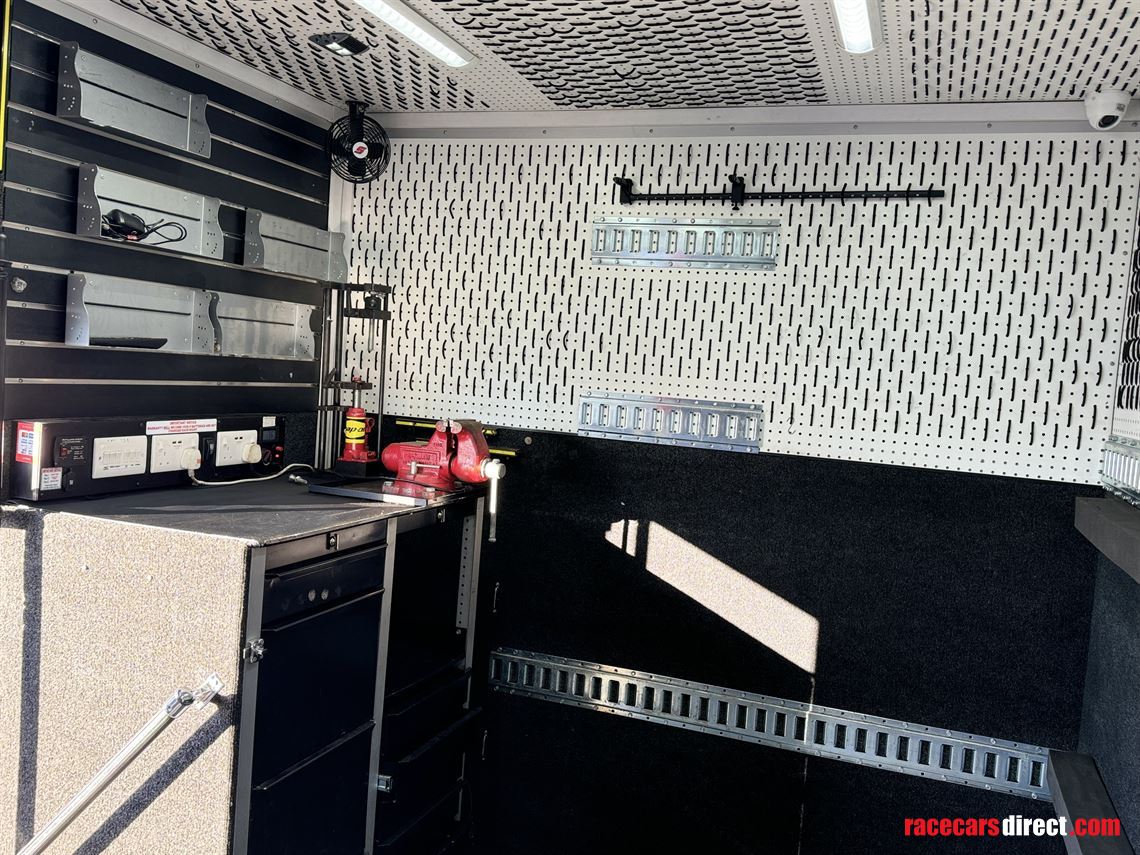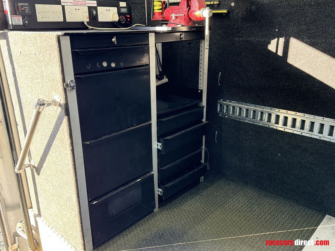 Equipped with a workshop area with a handy vice and secure parts drawers. Loads of storage space for parts or to even extend the living quarters.