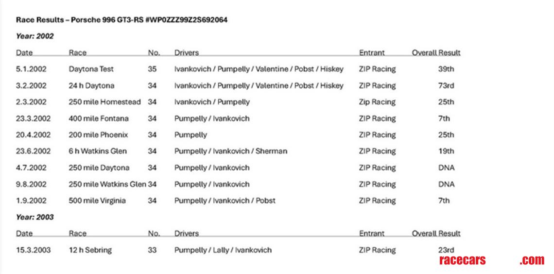 Our car, VIN Nr #2S692064, was supplied by the factory on December 4th, 2001 through Porsche Motorsport USA to the ZIP Racing Team (Steven Ivankovich) who immediately entered the car for the 2002 and 2003 US-racing season with the main events being the 2002 Daytona 24hr, the 6 hours of Watkins Glen and the 2023 Sebring 12 hours where the car ran with race nr 33 in black “Hazardous” livery. After its last race at Sebring (the full race history of the car can be seen below in the History section) the car was re-painted in its current orange Hazardous livery and used as the T-car for the team’s other 996. The car stayed unused with ZIP Racing for several years until it was brought to UK by GT Classics and sold to its current Portuguese owner in 2018, who used the car sparingly thereby only adding two hours of running time to it.