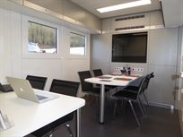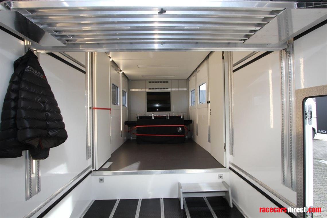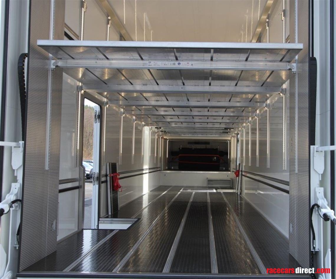 2 axle chassis from Schuler, 2.3 t horizontal lift, double deck loading system, aluminium exterior panels, underfloor storage boxes, transport area for up to 5 vehicles, workshop, transport parts and panelling, Office with Vario function, folding wall between transport area and office, office with up to 6 workstations, compressor, and much more.
