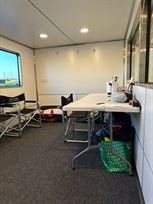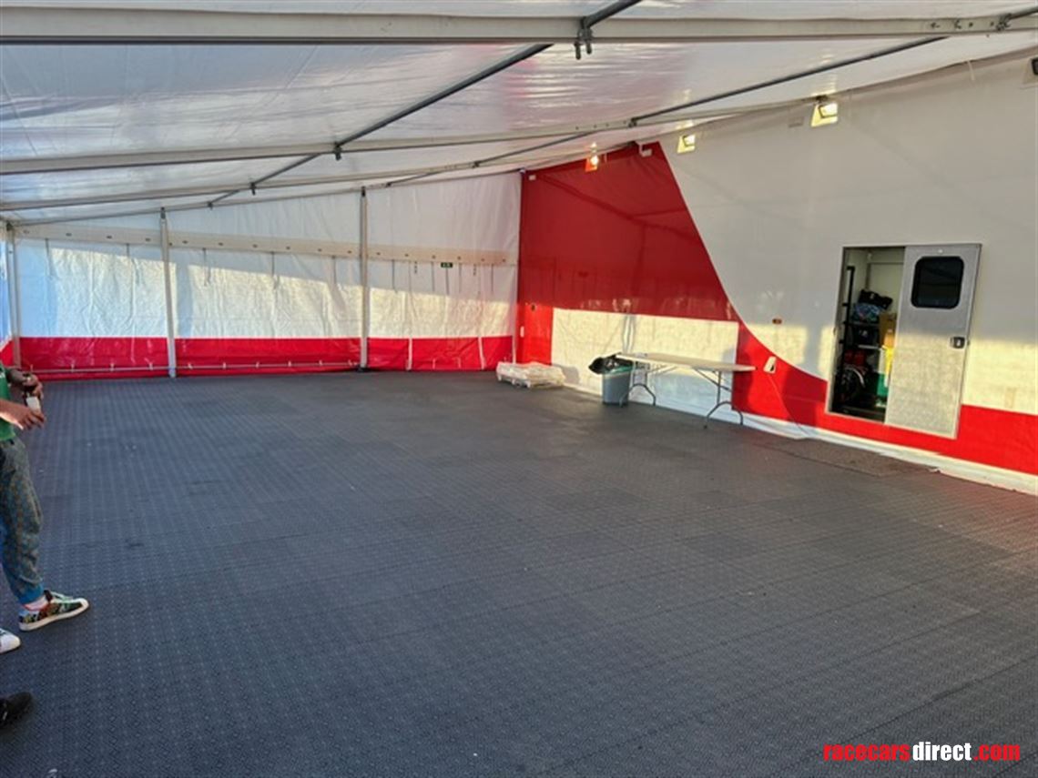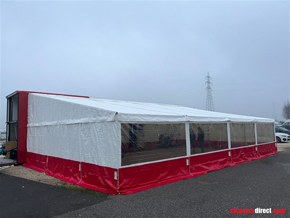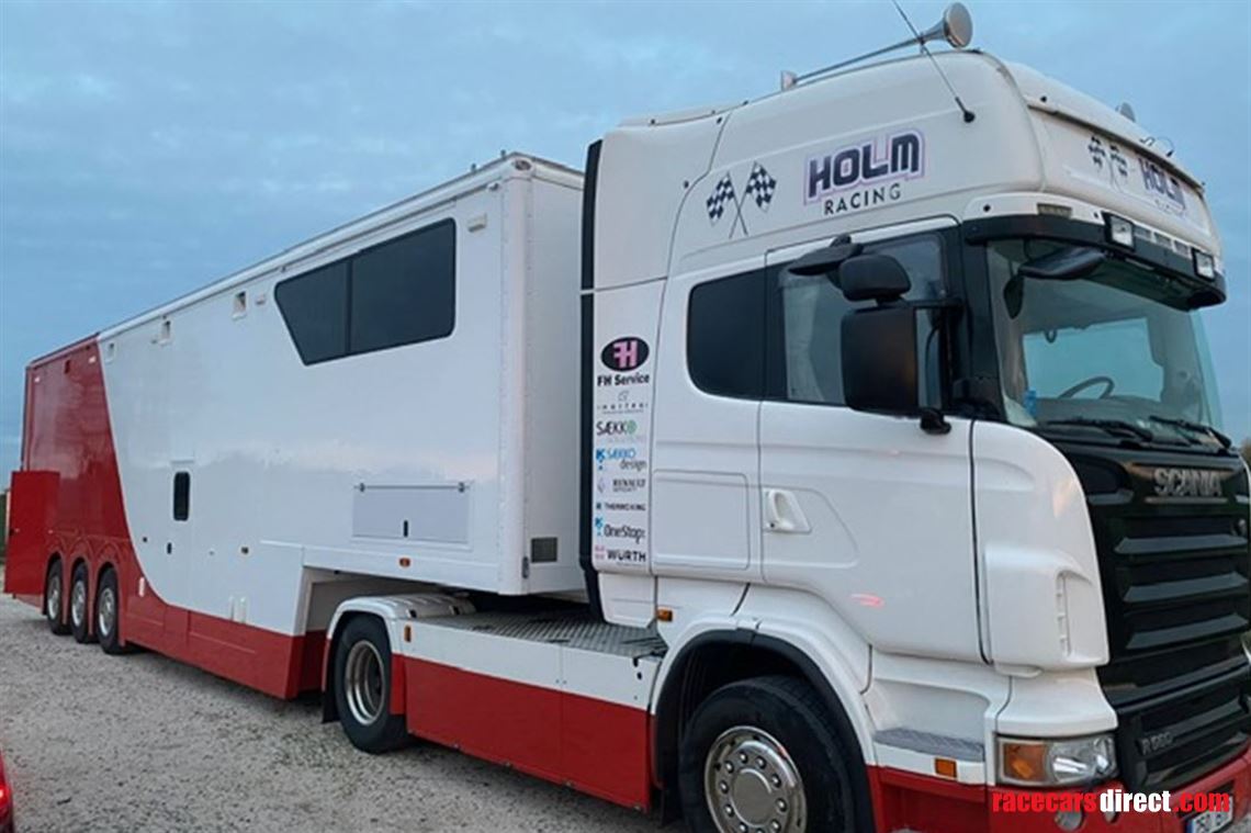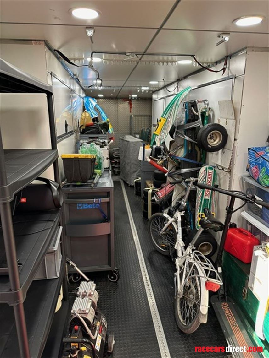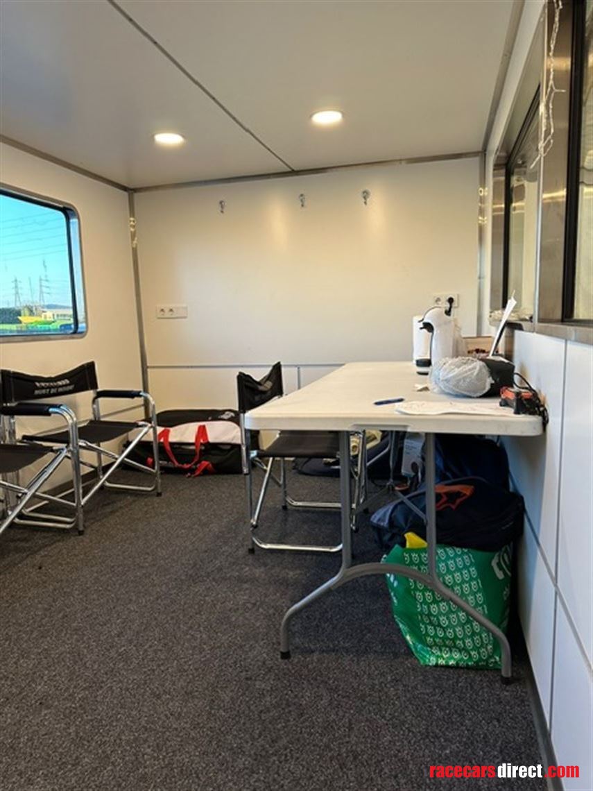 Space for two GT cars, or rally cars ore many motorcycles or go-karts on the upper deck. Full size tail lift. Lower deck plenty room for equipments. Two workbench, and one storage room. Water tank. Office on the front area. Heating, cooling system and lights are controlled by phone app. Full size awning and flooring. Air and power outlets outside and inside. On board compressor.