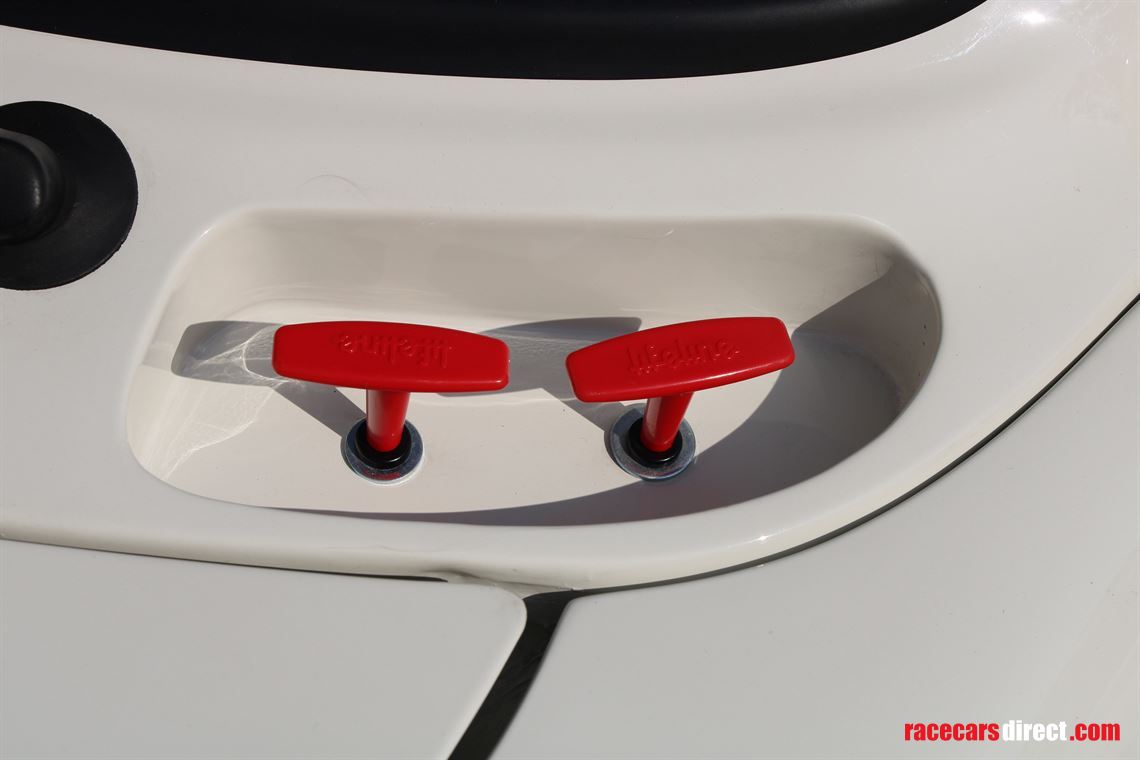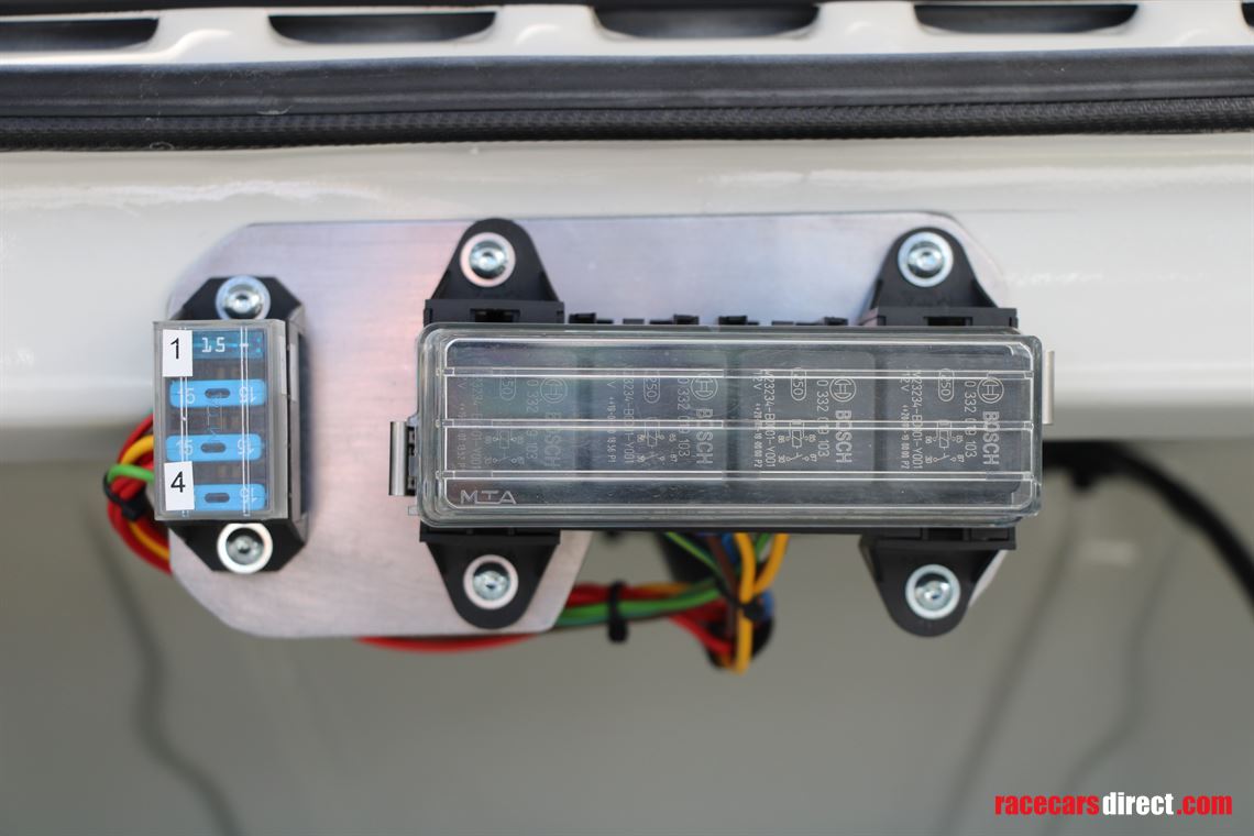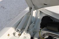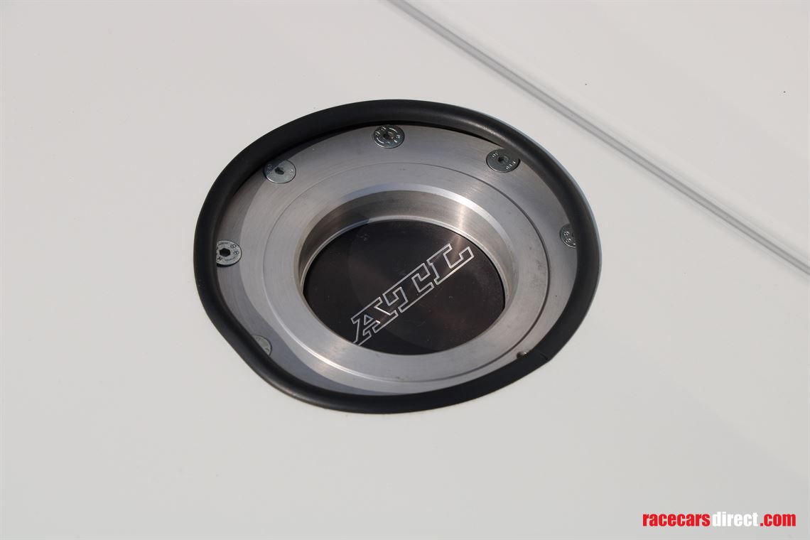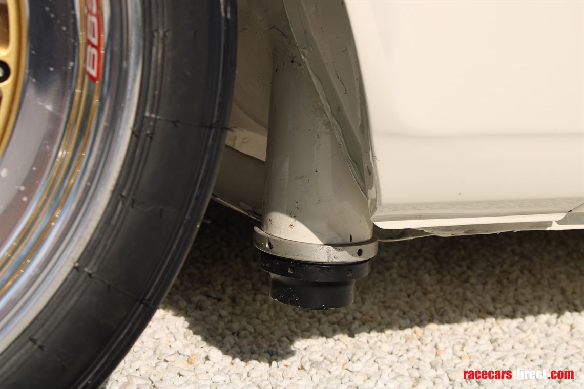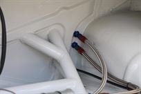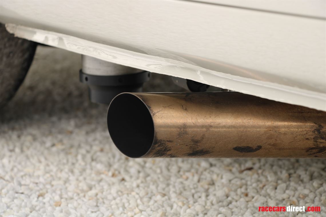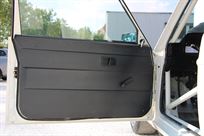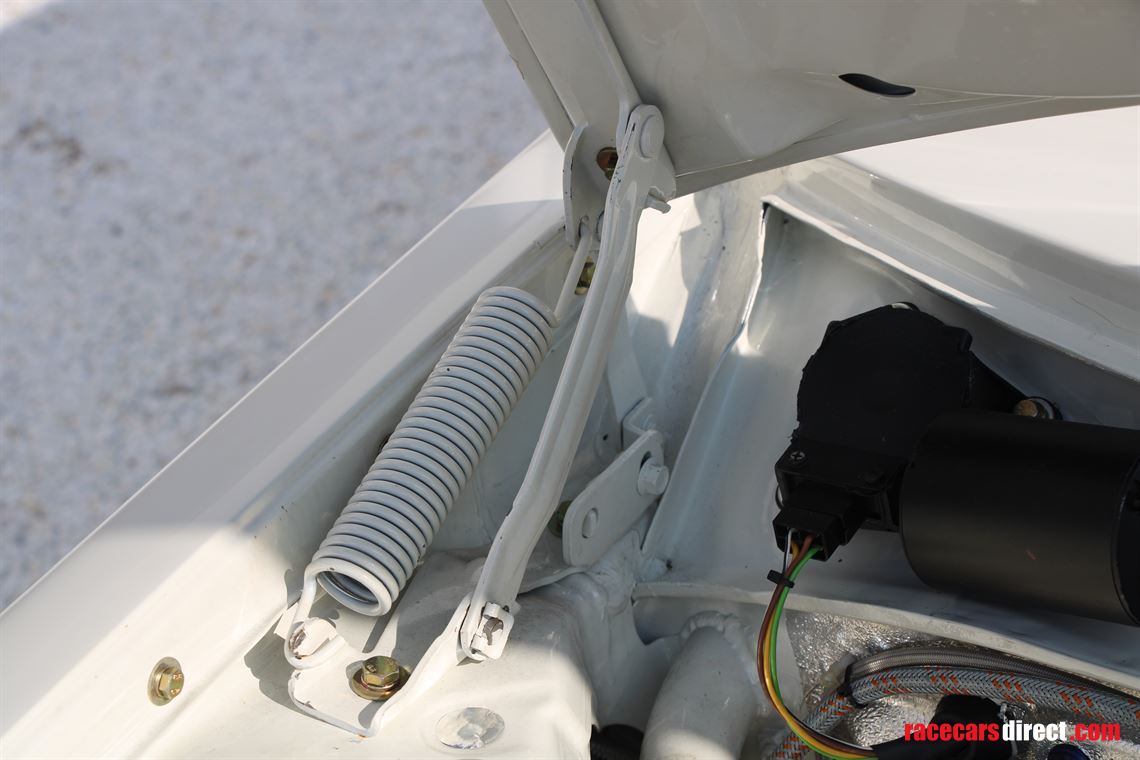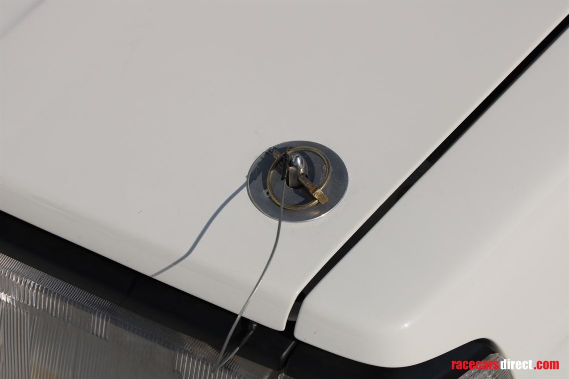 When looking at the exterior of this car, we can find a beautifully finished white paintjob. This colour was applied on every single panel of the car and the execution of the paintjob was done to a very high standard. The engine compartment, luggage area, underside and interior are all finished in the exterior colour and give the car a very clean and sterile presence. To prepare the car further for the track, an air jack system was fitted. This allows for a quick lifting of the car and eases the process of changing the tyres. The wheels of the tyres are the period correct BBS centerlock rims. These are the only ones that are FIA approved for this car. When continuing on the side, we can also find the side mounted exhaust pipe. This is a free flowing system without any mufflers present. This lets the car really come to life, once started. When the car is used hard on track, this side exhaust will even shoot flames on the overrun. When we look at the back of this 240, we can see that the boot lid has been upgraded. It has been fitted with the correct rear spoiler and has 2 cutouts for the fuel nozzle, one on each side of the car. These allow for quick refuelling during a race. Something not very visual for most, but important on the race track are the front and rear bumpers. These have been shortened and positioned more closely to the bodywork. The front bumper was even lowered to generate a more aerodynamically efficient surface on the front of the car. Last but not least, a battery disconnect and fire extinguisher lever were fitted on the front drivers side of the car. This allows for emergency workers to activate these from the exterior of the car in case of an accident.
