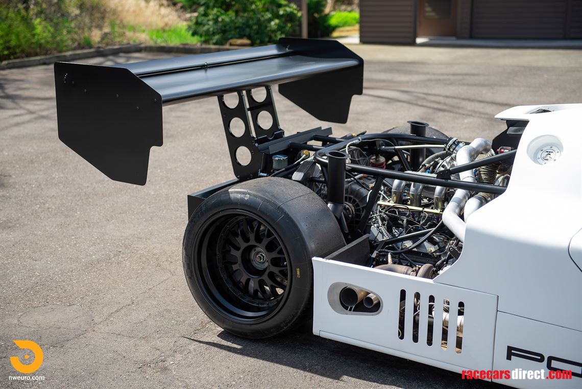 Finished in white with black Porsche rocker panel graphics, the body is ready for the next owner to personalize with their own racing livery or historic period livery. The overall cosmetics are quite nice, including smooth body surfaces, clear windows, and a fantastically wide rear view topped by the massive rear wing. The car sits on a set of custom BBS competition wheels finished in black, setting off the aggressive character of the finished car.