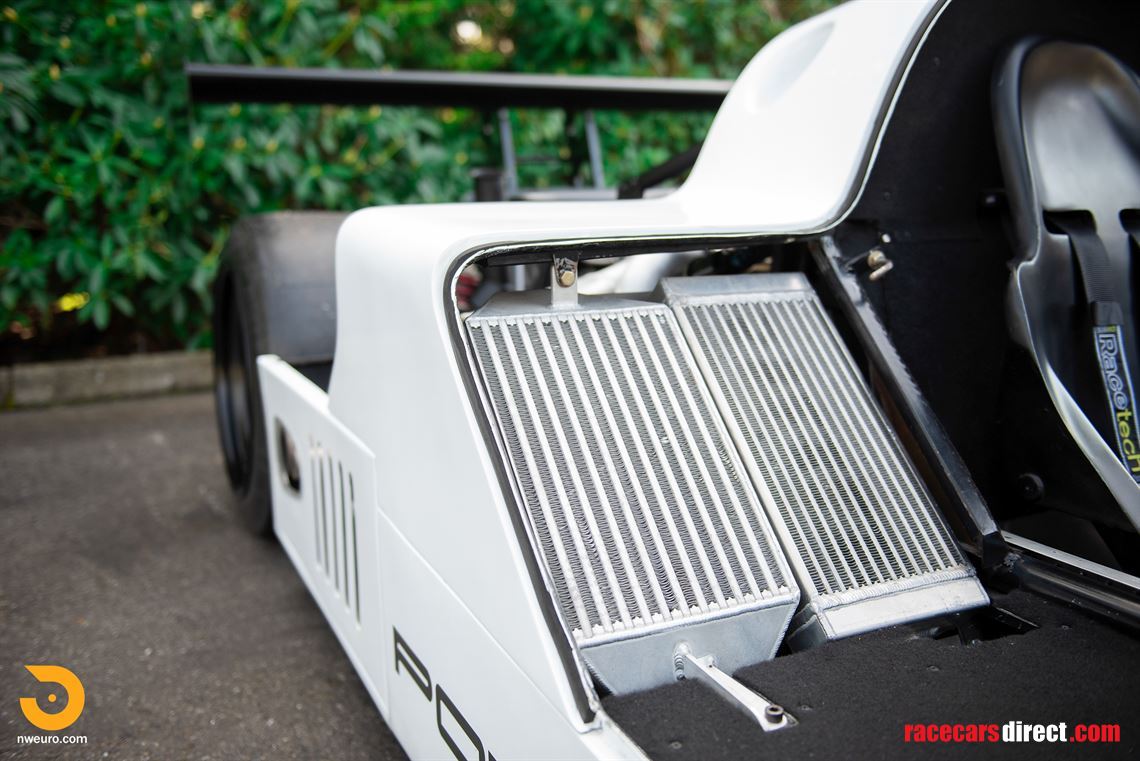 The final build, completed under current ownership, proceeded with the integration of numerous factory 962 Porsche parts including front hubs, A-arms, shock absorbers, a complete pedal cluster, steering column, body support tubing, factory 962 tail lamps, door and body latches, and flat bottom front belly pans. Additional mechanical features further incorporated into this remarkable build include a Redline (Fabcar) rear wing, correctly sized radiators and coolers, 8-piston front caliper Brembo ventilated disc brakes (with bias control) sourced from a factory Audi race car. Additional features include Porsche 996 Twin-Turbo S rear disc brakes, 993 Super Cup rear suspension with factory upgrades, and an inverted 930 Porsche transaxle with cooler and limited-slip differential. Though it involved challenging package engineering, the inverted gearbox delivers a much lower overall vehicle center of gravity, more favorable drive shaft angularity, and greater CV joint range, all of which contributes to improved performance and mechanical endurance.