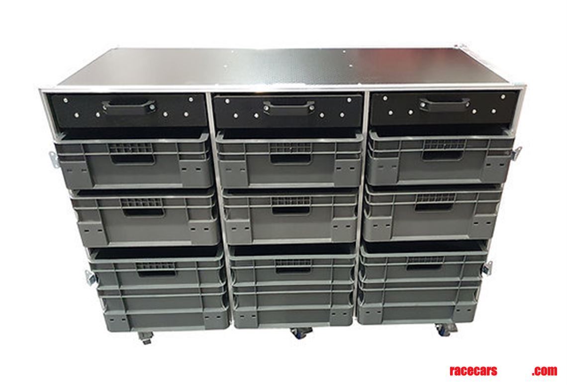 To each side of the tool box are a column of euro containers with a parts storage box at the top.