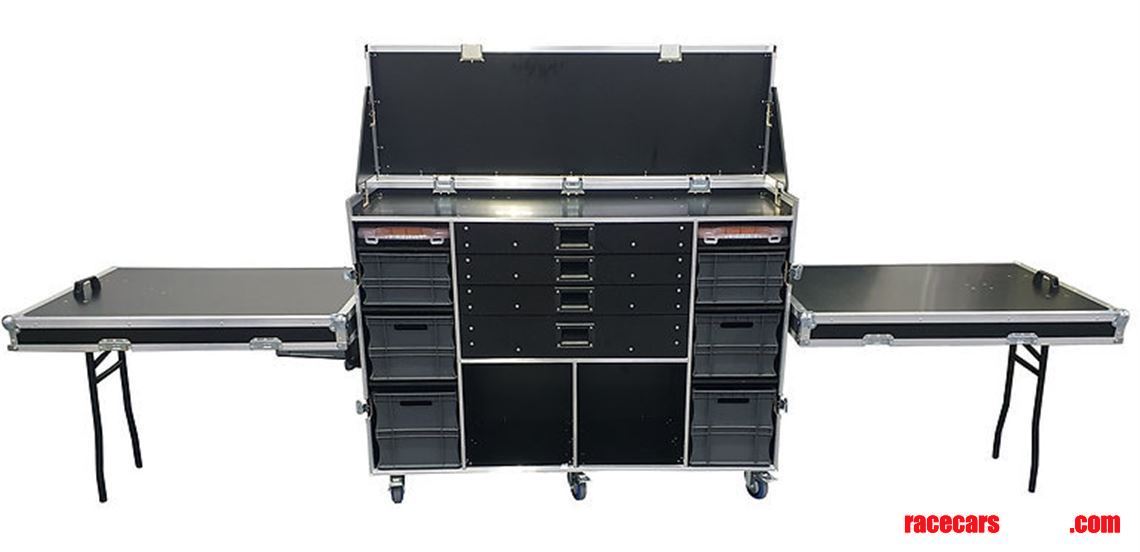 The front covers are removable and are supplied with table legs inside so that they can be attached to each side of the case as side tables. Creating an extra large working area from the case foot print.