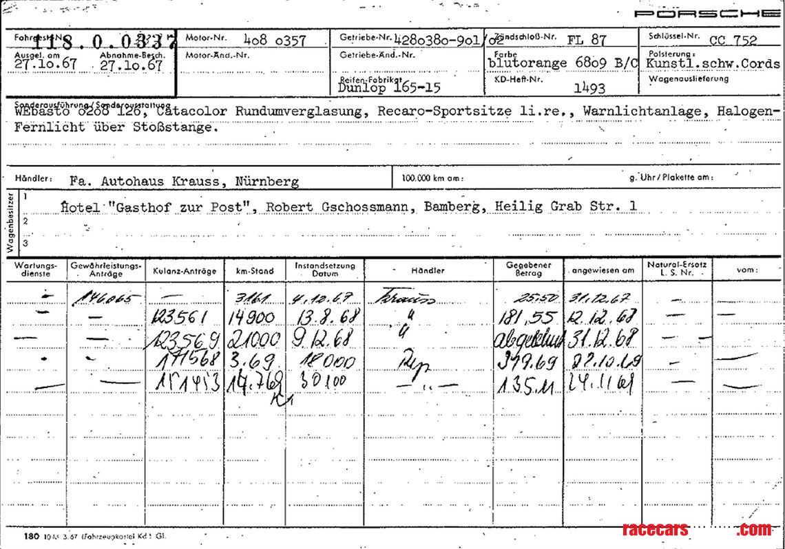Chassis #11800337, a 1968 911S Tangerine coupe built on October 27, 1967, became O’Neil’s next race car. Originally sold through Autohaus Krauss in Nürnberg to Robert Gschossmann in Bamberg, Germany, it featured a black vinyl interior, Webasto heater, tinted glass, sport seats, and through-the-grill driving lights. After Gschossmann’s passing in 2022, early German history remains limited, but the car’s “Wagenpass” and Kardex confirm its authenticity.