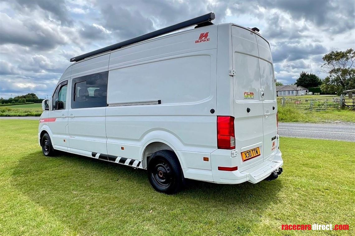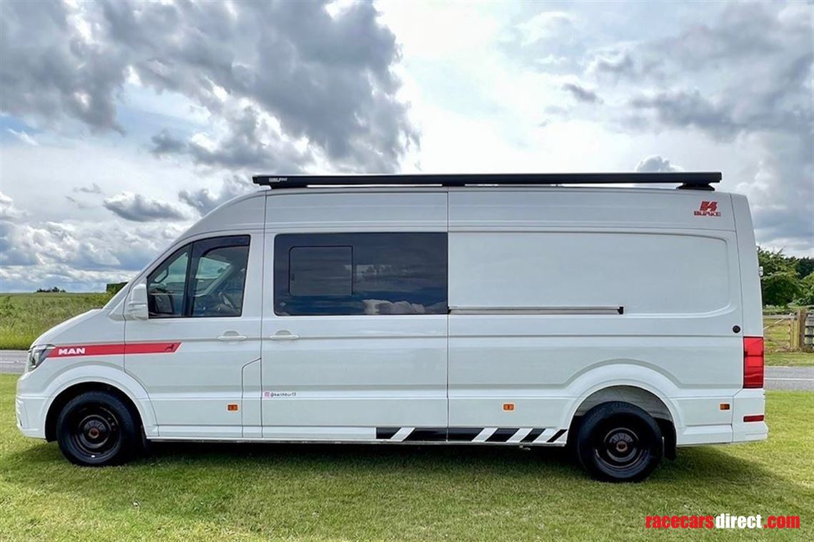 Man Camper 2020 (July) man van 3.5T TGE one owner van from new with service history. Camper construction was done in June 2024 in the uk costing over costing £30,000 It was designed for racing it has a workshop at the rear for a kart and all tools and equipment required. It also has a tow bar to tow a race car and can come with this new Brian James trialer if needed ( €6,500 ) Van sleeps 4 people with ease and has been converted to the best possible standard with absolutely no shortcuts! Full kitchen with 2 gas ring cooker, sink, oven and grill! Kitted out with solar panels so off grid/ track side for days is no issue. TV and lighting all top quality. Night heater and insulation make sleeping out a joy. Van is top spec with rear air suspension, turning front seats, leather steering wheel apple car play really make for a nice driving van. Also has a map with more power and torque. Sold with full service, new timing belt, new MOT ready to go for new owner.