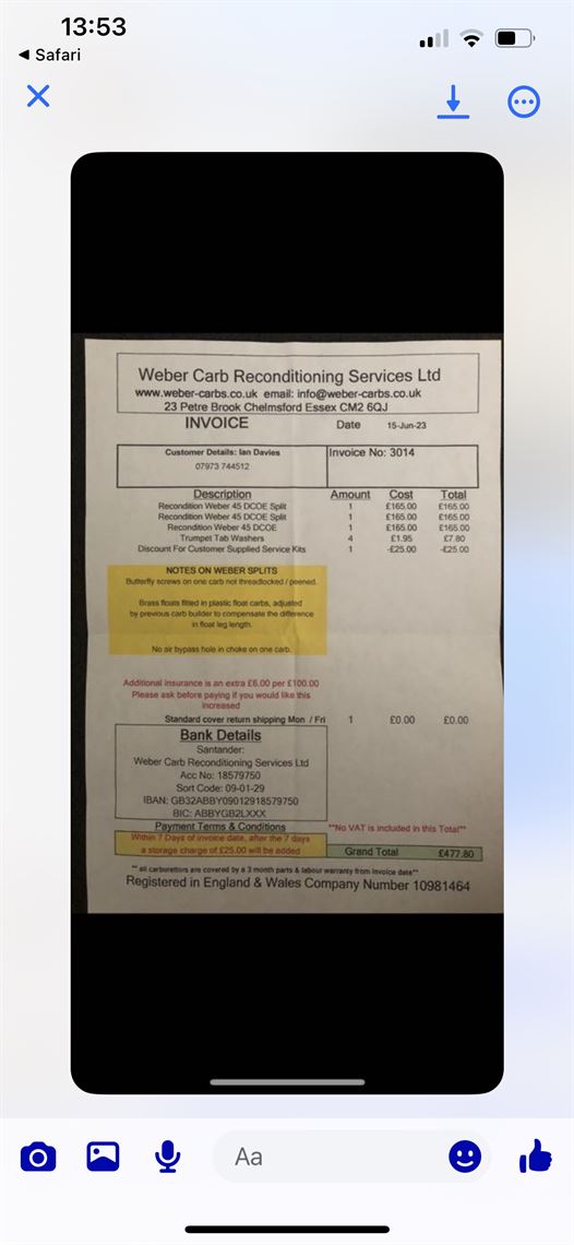 Note: Images show screws missing. They are not missing . They have been removed to show the top of the carb. They are in the magard linkage. The invoice shows rebuild to splits and single. Cost for the single was £165 plus parts.