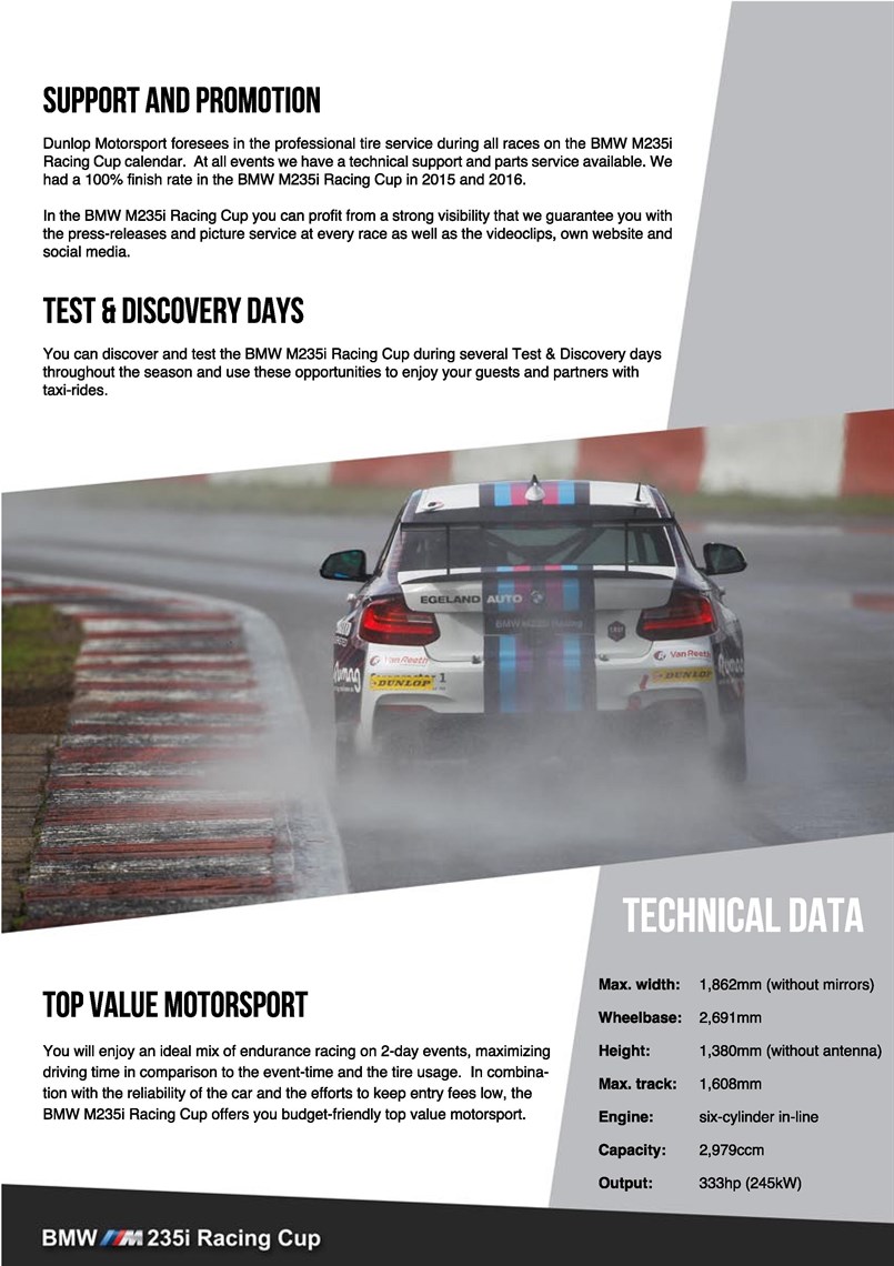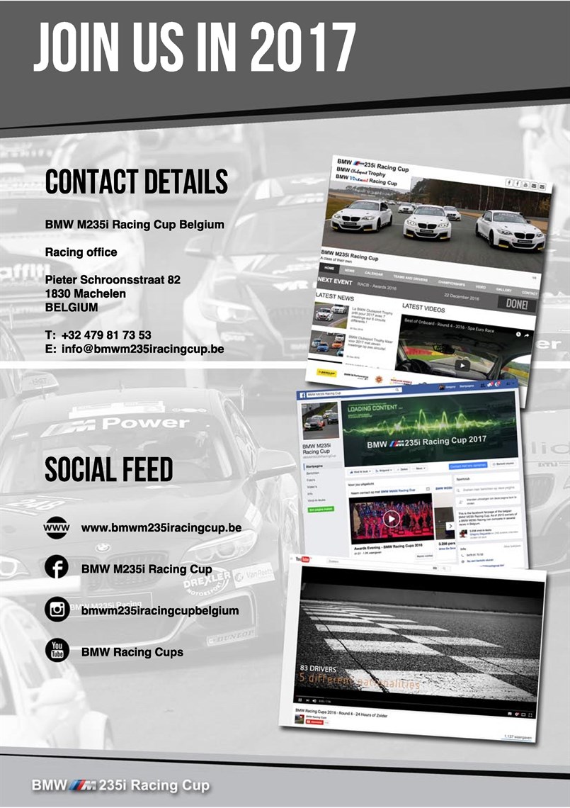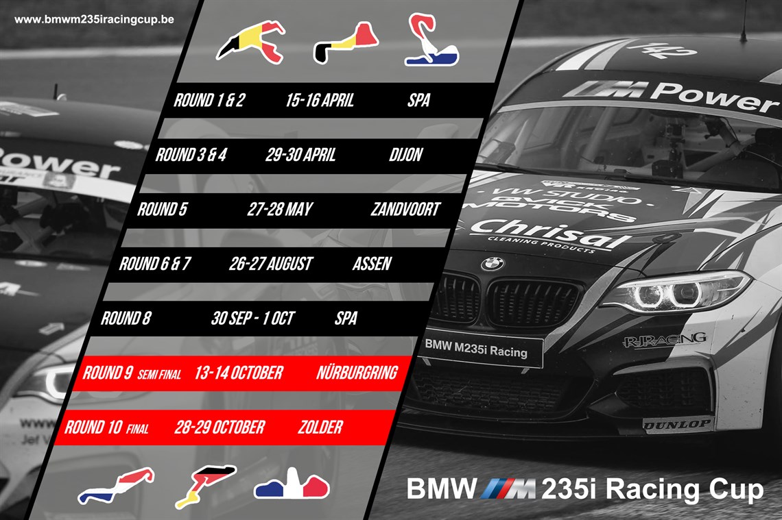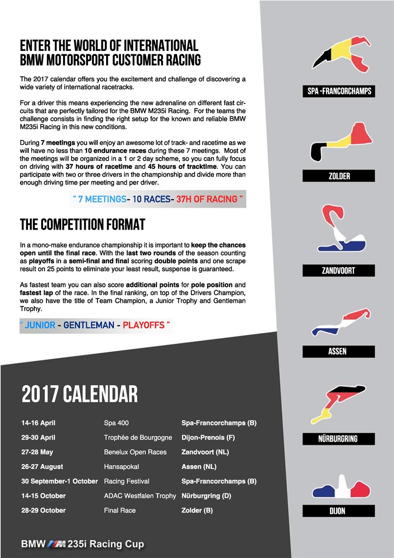 The 2017 BMW M235i Racing Cup Belgium has become a FIA International Series with 7 Meetings and 10 Endurance Races on beautifull and exciting racetracks. Maximum seattime per event as events are 2-days events. Drivers as of 16 years old.