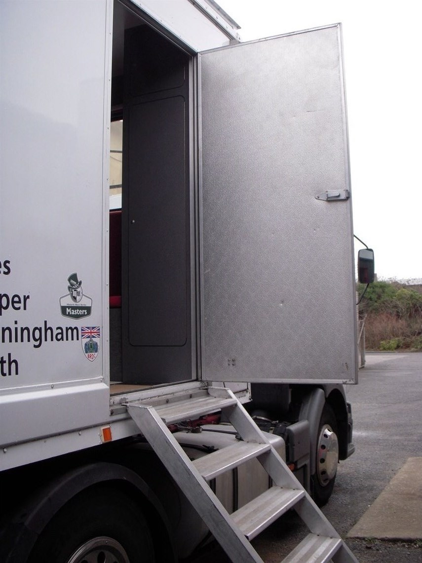 Front office comprising of seating area for 4/6, sleeping area for 2 plus 1 in cab, shower and toilet room, tv with satellite dish, fridge, hob, sink and cupboard space, with side door and access steps.