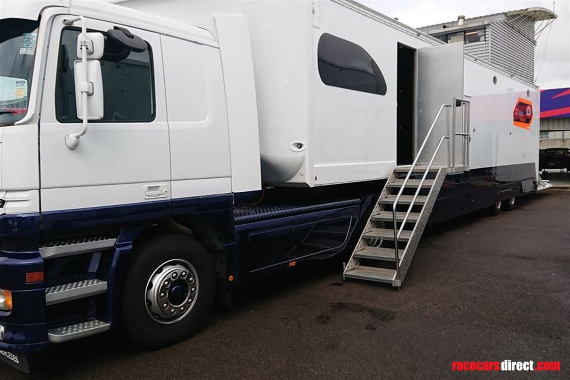 GT Marques race truck & trailer twin deck takes four cars , Office area with two sleeping bunks , bench leather seating, Air con & heating, Micro-wave , Fridge , all fitted with storage space lighting everywear . Wired for satalight TV .Eight meter awning company awing with storm bars fitted all in good working condition, Dellanda tail lift 2 ton capacity with saftey rails .